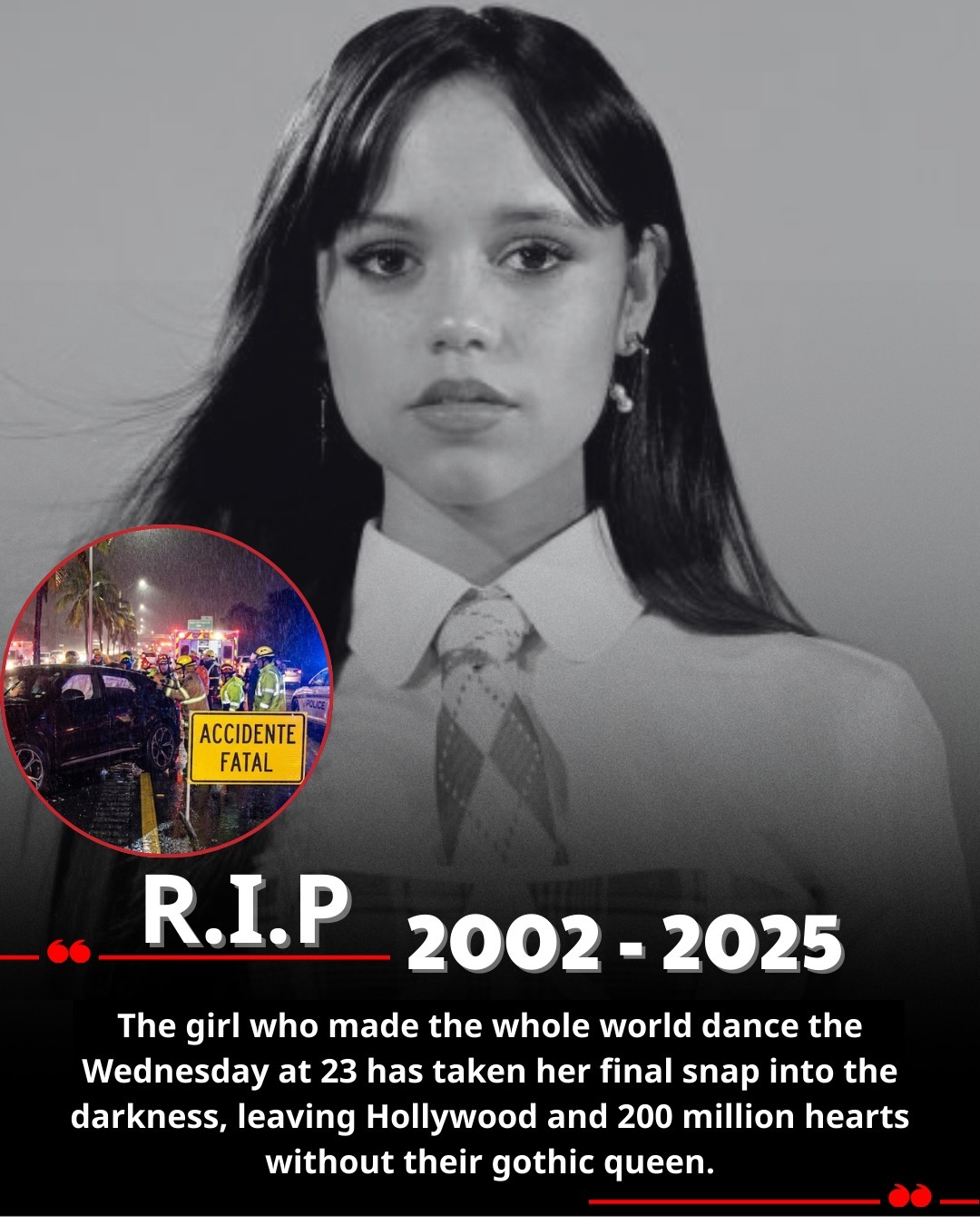 In the past few hours, a shocking story has circulated online claiming that actress Jenna Ortega was involved in a fatal car accident in Los Angeles, after her black Mercedes-Maybach collided head-on with a semi-truck on the 101 Freeway late last night. Social media posts have claimed that paramedics arrived within six minutes but were unable to save her life. These reports are entirely false. Jenna Ortega is alive, unharmed, and continues her normal activities.